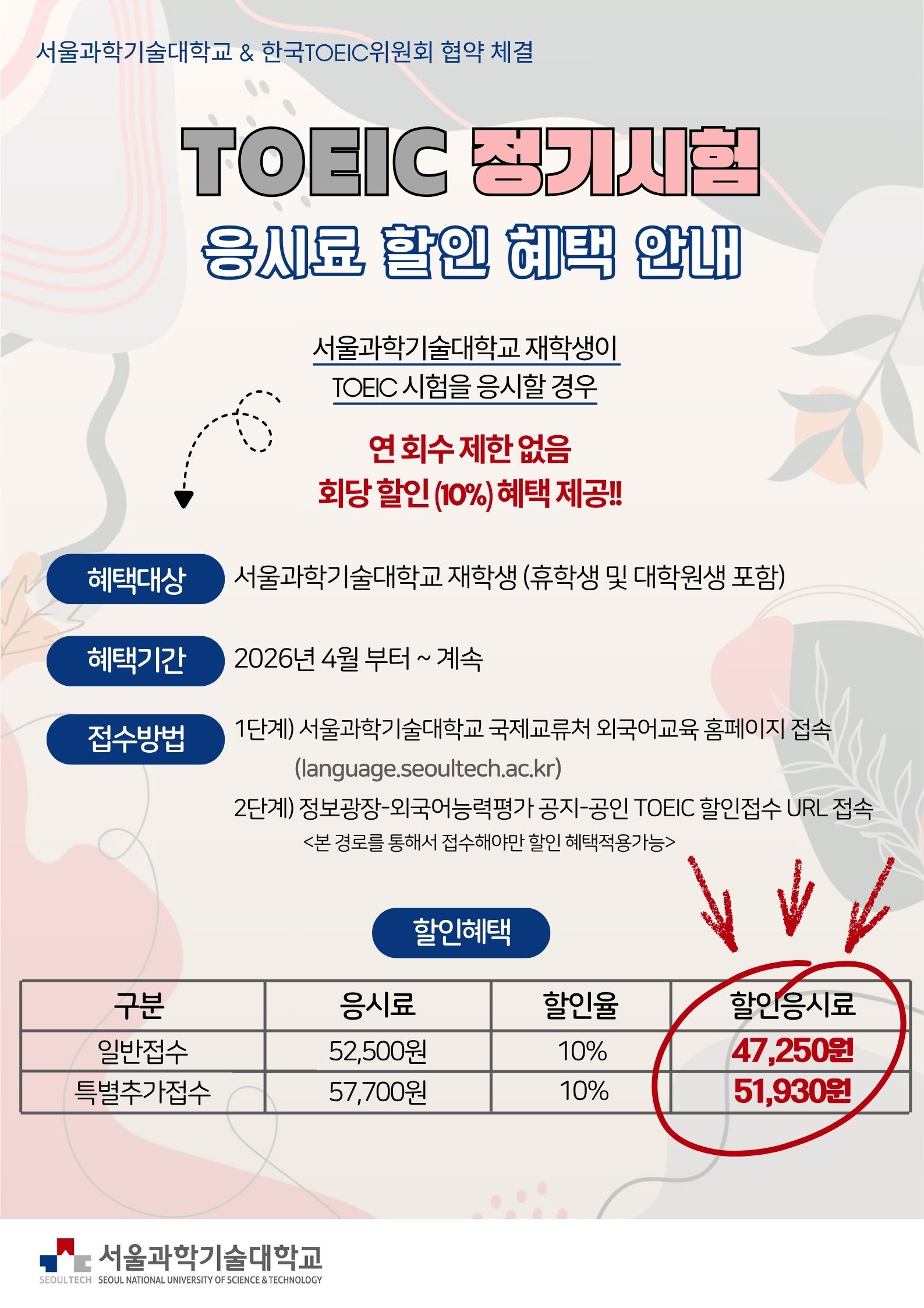 위의 링크를 통해 접수해야 할인 적용 가능 (서울과기대 학생이 아닐 경우 인증 및 할인 결제 불가)